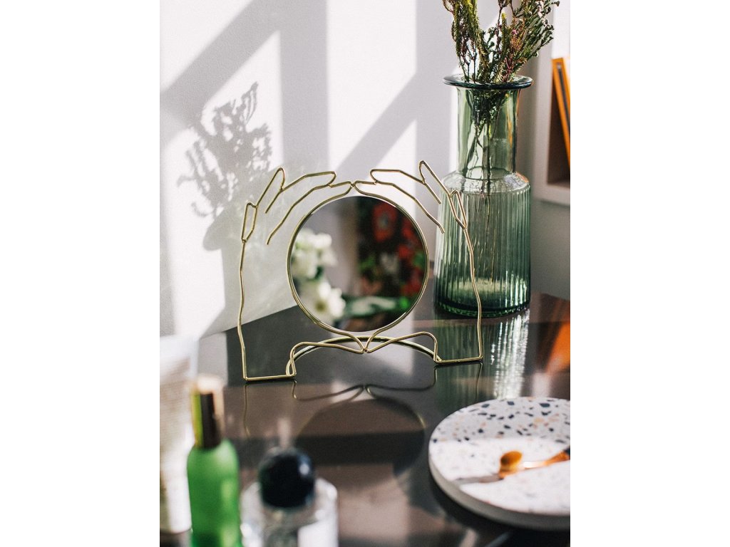 Štýlové zrkadlo Xéria z elegantnej zlatej nehrdzavejúcej ocele ponúka dve možnosti použitia - možno ho položiť na stôl alebo zavesiť na stenu. Vďaka kompaktným rozmerom 26 cm je ideálnym doplnkom moderných aj klasických interiérov. Perfektne sa hodí na rýchle úpravy dekorácií, líčenie alebo ako praktický dizajnový prvok. Autentický a jedinečný štýl je navrhnutý tak, aby naplnil váš život novými emóciami.